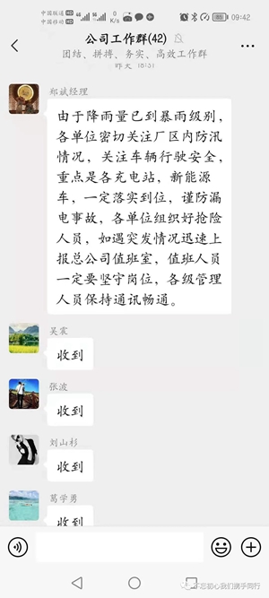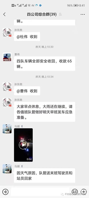 一是信息共享。總公司通過微信群、車內(nèi)監(jiān)控、GPS定位等手段,及時將線路運行情況、危險路段道路積水情況、場站排水情況等信息進(jìn)行共享聯(lián)動,以確保及時準(zhǔn)確下達(dá)工作指令。