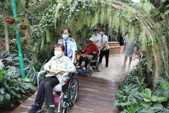 隨后,志愿者和護(hù)工們推著輪椅上的截癱休養(yǎng)員、挽著智障兒童,乘坐兩輛新能源低踏板公交車來到南湖景區(qū)植物風(fēng)情館參觀游覽。一行人漫步在高大茂盛的熱帶植物叢林中,志愿者按照標(biāo)識(shí)耐心地為截癱休養(yǎng)員和智障兒童講解植物信息,愉快的交談引得歡聲笑語久久回蕩。“現(xiàn)在城市發(fā)展越來越快,公交車也越來越舒適了,雖然離南湖很近,但是我們出來不方便,這次能出來看看,真是特別感謝。”一位截癱休養(yǎng)員高興地說。