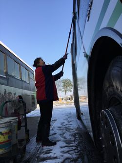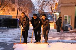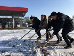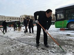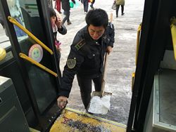 5點(diǎn),分公司、路隊(duì)兩級管理人員全部按照分工,到達(dá)指定線路、樞紐站,開始協(xié)助司機(jī)加水、熱車,做好發(fā)車前的準(zhǔn)備。6點(diǎn)半,總公司、分公司機(jī)關(guān)管理人員開始清掃站點(diǎn)積雪;客流集中的各大站點(diǎn),管理人員已經(jīng)在疏導(dǎo)乘客,指揮車輛進(jìn)出站。初冬的凌晨溫度最低,冷風(fēng)直透心底。上午9點(diǎn)多,當(dāng)直播五十分和唐山交通臺的記者趕到遠(yuǎn)洋城站點(diǎn)采訪時(shí),一公司的管理人員已在此堅(jiān)守了四個(gè)多小時(shí)。大雪讓車身結(jié)了厚厚的一層冰和泥,保潔員們用工具一點(diǎn)一點(diǎn)艱難地清理著。
