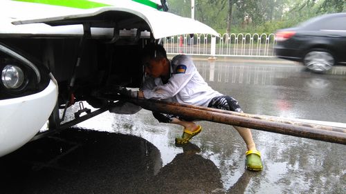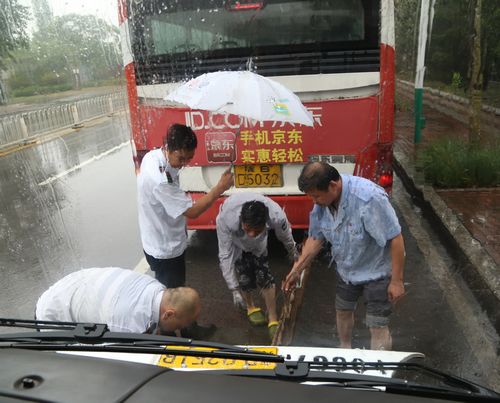 12時30分,207路車在行至開平路段時出現(xiàn)故障。機務(wù)隊長張繼民立即開著拖車前往現(xiàn)場,不料返回途中拖車也壞了,得知情況的隊長立即與修理車間聯(lián)系,又派出安全員孫濤、張利明和修理工王金偉火速趕赴現(xiàn)場冒雨搶修,直至晚上六點多,故障車和拖車才順利返回車場,而參與搶修的幾名工作人員早已經(jīng)全身濕透。