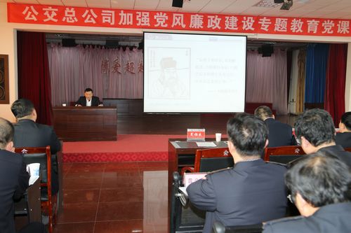 為切實履行黨委黨風廉政建設主體責任,提高各級黨員干部的拒腐防變意識,總公司黨委于3月25日在丁家屯車場會議室進行了題為“加強黨風廉政建設,推進唐山公交健康有序和諧發(fā)展”的廉政教育專題黨課,由黨委書記、副總經(jīng)理夏保良主講??偣救w班子成員、中層干部以及所屬各單位科隊長以上干部,計三百余人接受了廉政教育。黨課由黨委副書記、紀委書記客林榮主持。